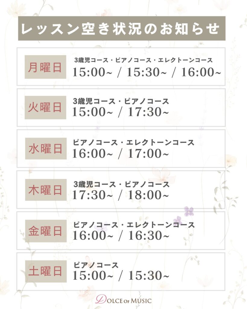 レッスン空き状況のお知らせ 2025年12月09日 2025年12月現在のレッスンの空き状況をお知らせいたします。空き時間ごとの担当講師については、お問い合わせフォームよりお問いわせください。 お問い合わせフォーム