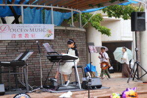 お天気が悪くて外ではできず、ダスキン2階のイベントスペース(ビルの中)で開催しました♪ 緑に囲まれた素敵な場所“2023江坂ミュージックストリート鍵盤ELP 無事終わりました!”
